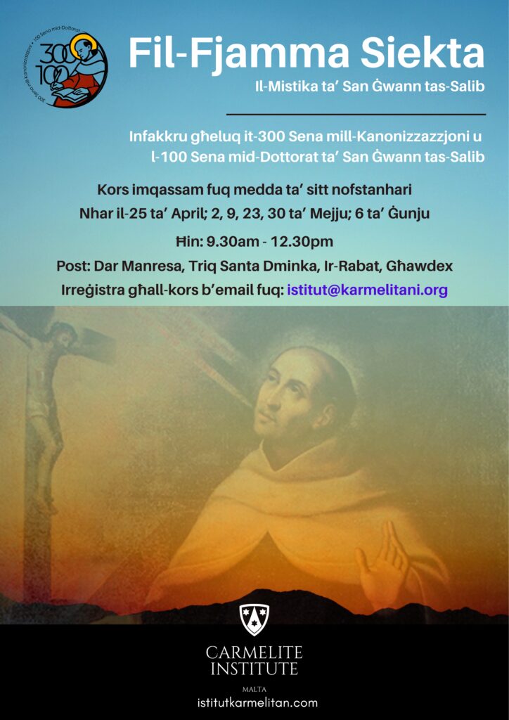 F’għeluq it-300 sena mill-Kanonizzazzjoni u l-100 Sena mid-Dottorat ta’ San Ġwann tas-Salib, l-Istitut Karmelitan qed itella’ Kors miftuħ għal kulħadd li se jsir fuq medda ta’ sitt nofstanhari mmexxija minn diversi kelliema.